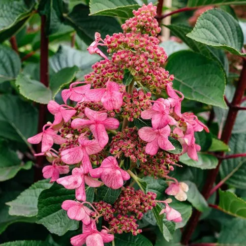Однако, настоящей изюминкой гортензии метельчатой Инфинити является ее соцветие. Тип соцветия - метельчатое, а форма - пирамидальная. Состав абсолютно уникален - соцветие состоит из стерильных и фертильных цветков. Длина соцветия достигает 30-40 сантиметров, а цветки при первом цветении белые, а во время вегетации меняют окраску на темно-красную. Аромат соцветия гортензии метельчатой Инфинити средний, что создает дополнительную романтическую атмосферу вокруг этого растения.